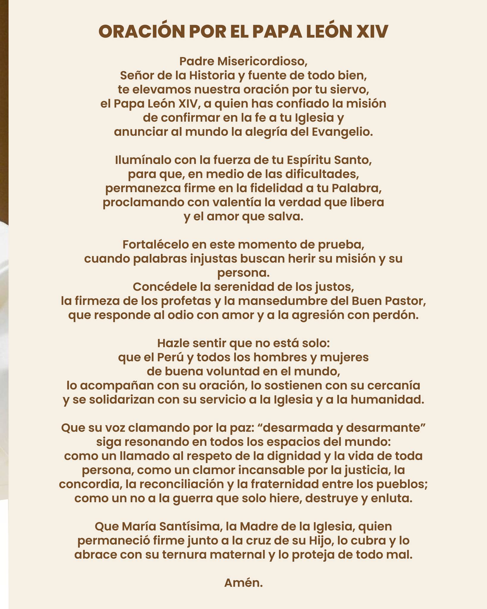Como parte de esta iniciativa, se ha difundido una oración especial por el Papa León XIV, en la que se pide al Señor que lo sostenga en los momentos de dificultad, le conceda fortaleza en la fe y lo acompañe en su misión de anunciar el Evangelio con valentía y amor.